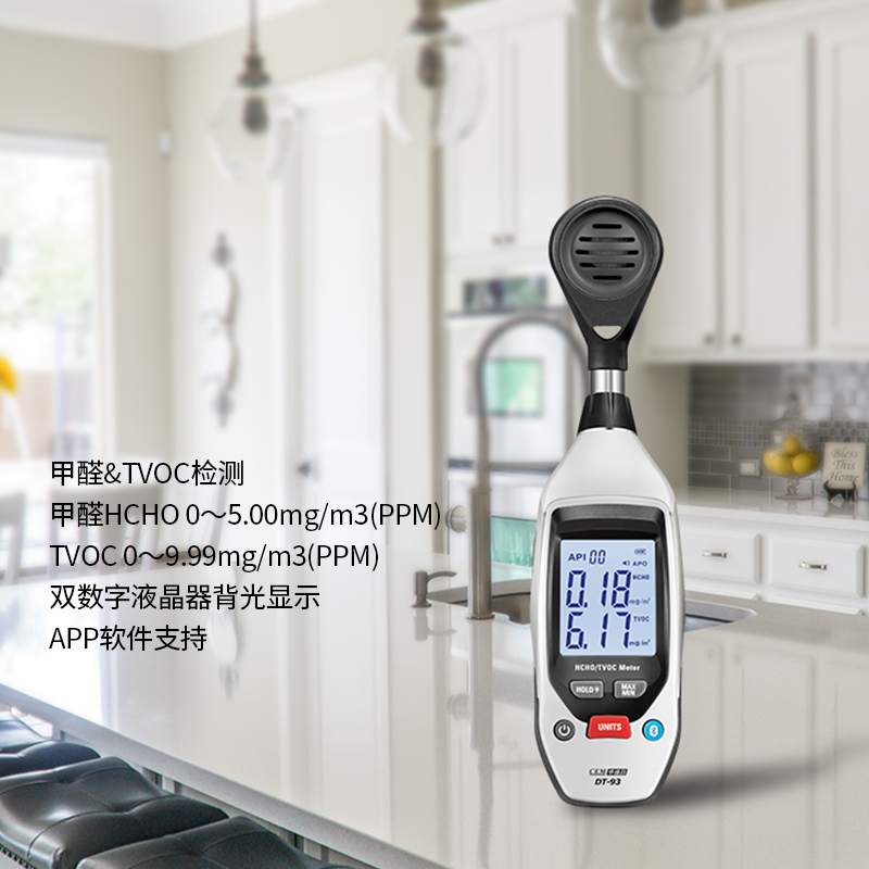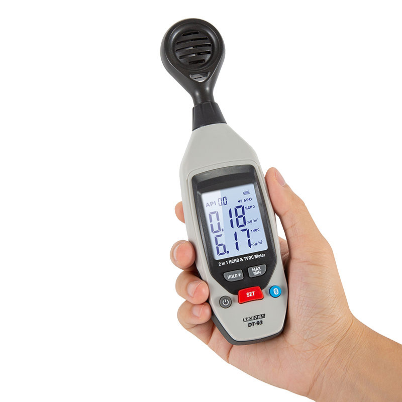 CEM華盛昌推出智能型迷你環(huán)境測試儀DT-93,為環(huán)境質量多維度的測量檢測應用上提供了產品解決方案和技術支持。這里所指的“多維度”,指對環(huán)境質量的甲醛/TVOC濃度的多指標一站式智能測量。