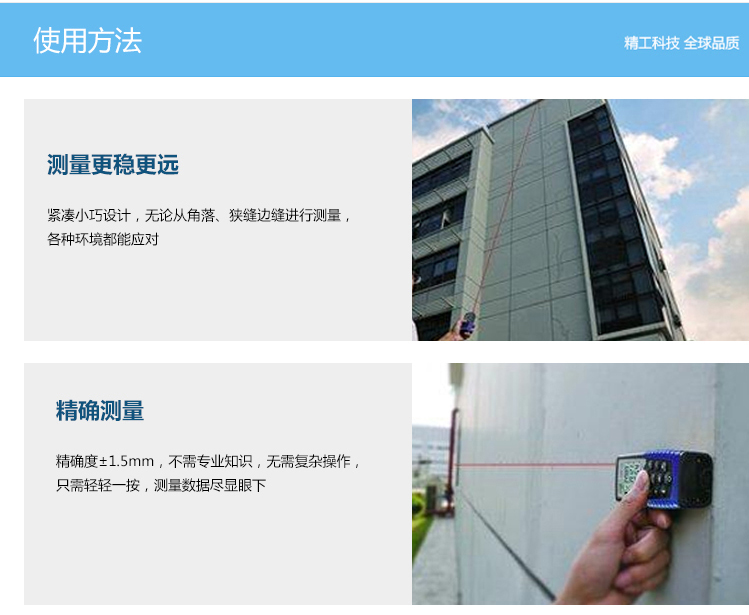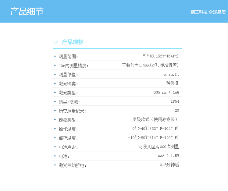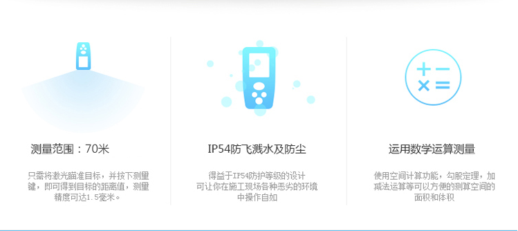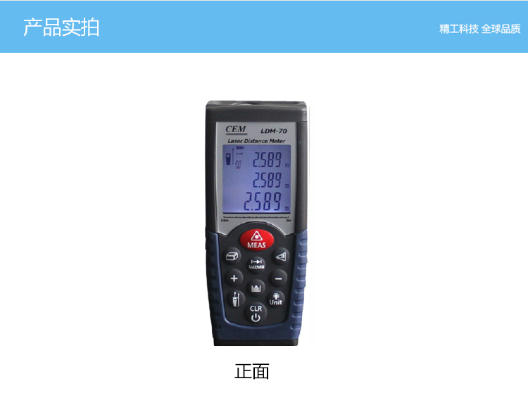 LDM-70為CEM自主設計、研發和制造的工業級遠距離手持式激光測距儀,使用簡單安全,僅需單人操作無需借助其他工具,即使在非常苛刻的測量環境中也能輕松應對。65米/70米能滿足更多工業與建筑行業的需求。 1、面積體積的計算功能; 2、運用勾股定理間接測量; 3、加減功能; 4、連續測量功能; 5、最大與最小距離跟蹤; 6、背光顯示與多行顯示; 7、蜂鳴提示; 8、精度±1.5mm; 9、外觀小巧,雙注塑防滑軟膠超舒適手感。