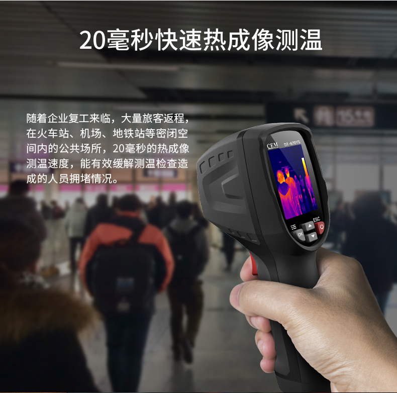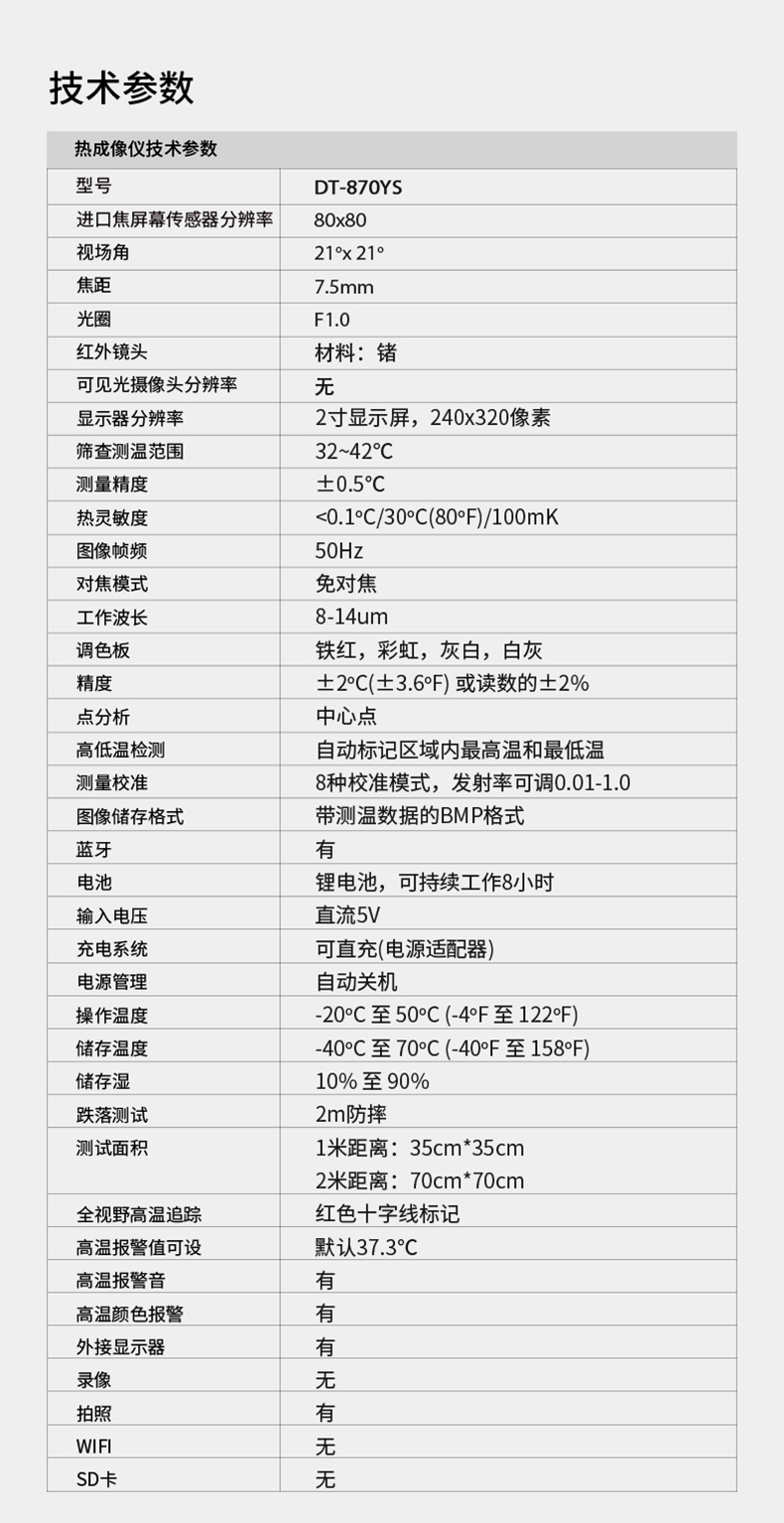 分辨率:80*80、圖像幀頻:50HZ、篩查測溫范圍:32-42℃、DT-8780YS外接10.1英寸PAD大屏,可實現多人同時測溫,AI人臉識別