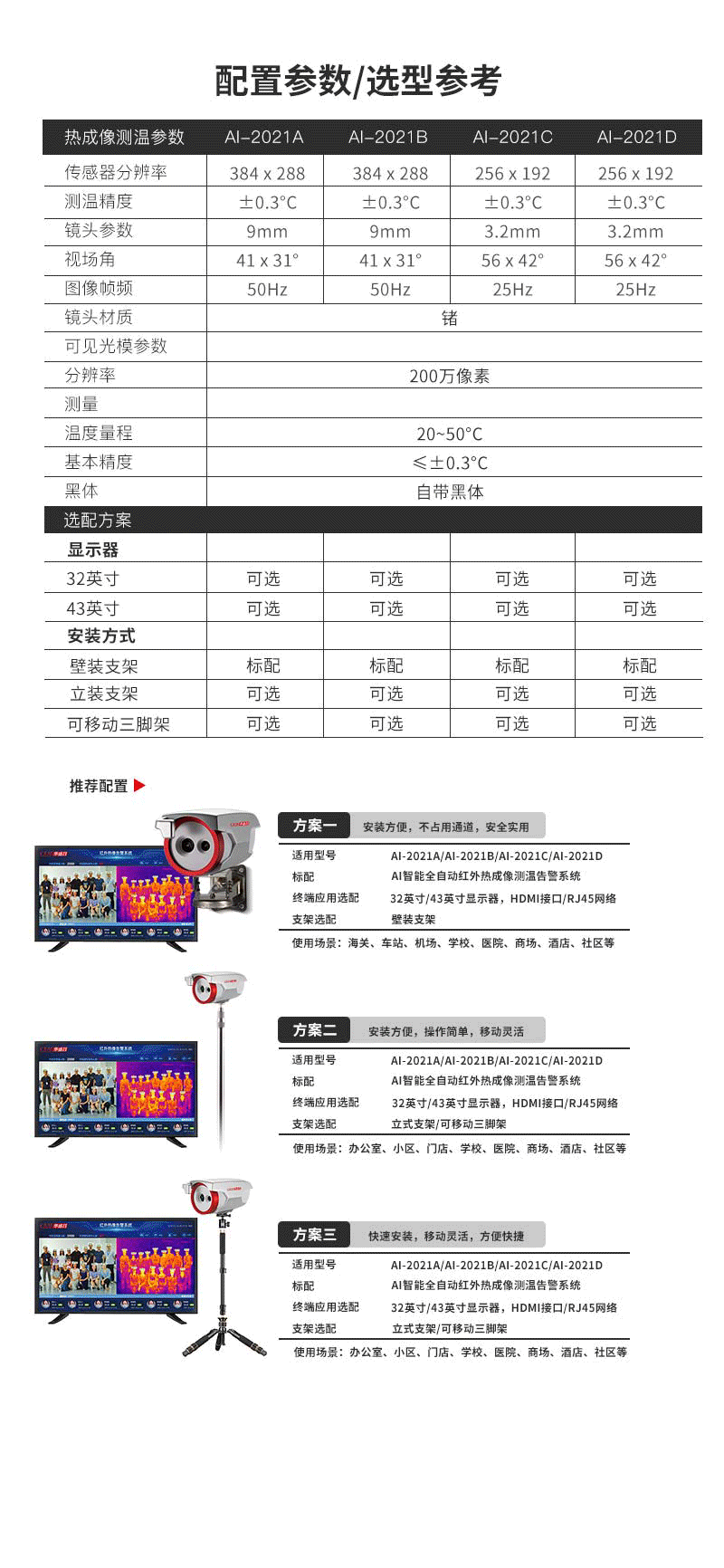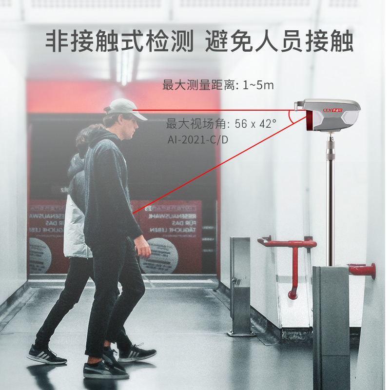 2安裝與維護(hù) 2-1,紅外熱像告警系統(tǒng)部署原則 Al-2021紅外熱像告警系統(tǒng)屬于精密測溫和成像設(shè)備,對部署應(yīng)用有一定要求,注意事項(xiàng)如下: ·安裝環(huán)境:設(shè)備機(jī)頭所處位置需光線良好(照明度≥10OLux),應(yīng)避免處于逆光的位置;設(shè)備機(jī)頭布置位置附近3米范圍內(nèi)不應(yīng)有空調(diào)出風(fēng)口;設(shè)備機(jī)頭所監(jiān)控的視場內(nèi),不能受到光照、西曬等外界強(qiáng)熱源的干擾; ·機(jī)頭布置:合理布置A-2021機(jī)頭的位置,向下俯視角度為13°~15°;合理布局人員檢測位置和范圍,AI-2021機(jī)頭的攝像頭距離被測人員的額頭的位置為1.0~5.0米,最佳測試位置為2.0米;