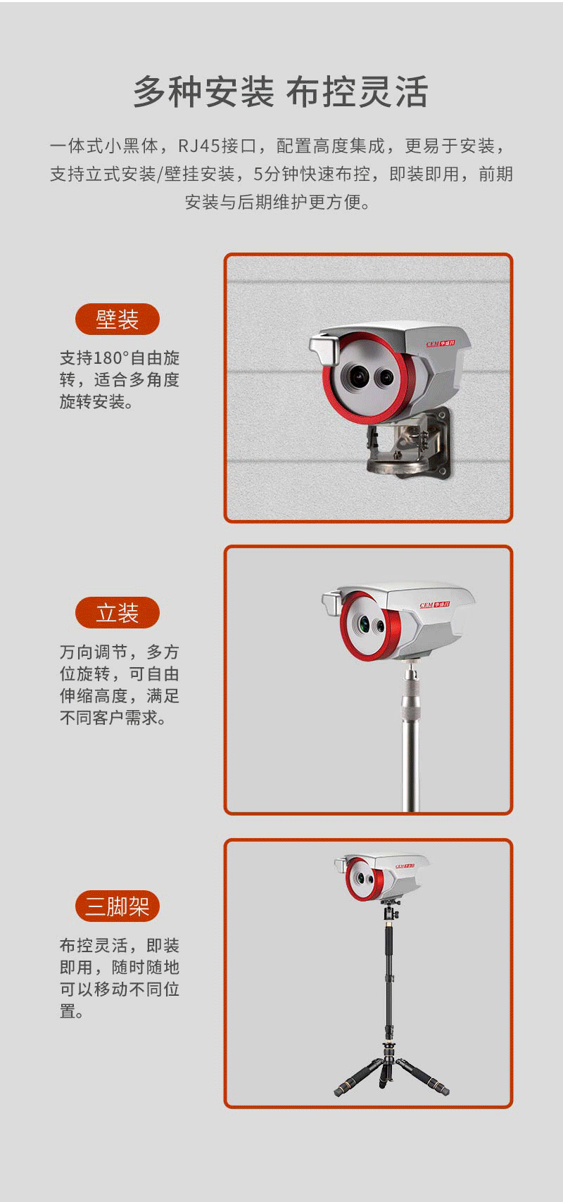 注意事項(xiàng) 紅外熱像告警系統(tǒng)應(yīng)正確安裝,可自動(dòng)跟蹤人體額頭區(qū)域并顯示體溫,操作人員應(yīng)經(jīng)生產(chǎn)廠家專業(yè)培訓(xùn),并嚴(yán)格按說明書使用。 ·應(yīng)嚴(yán)格按照中國國標(biāo)(GB_T19146-2010)和各地市場監(jiān)管局的要求創(chuàng)造使用條件;﹒嚴(yán)格按照規(guī)范要求,安裝在室內(nèi)無風(fēng)或者微風(fēng)的固定位置使用,室溫環(huán)境在16°℃~32℃,避免陽光、風(fēng)和其他熱源干擾(環(huán)境溫度超出16°℃~32°℃,需要安裝空調(diào),并在產(chǎn)品3m內(nèi)無風(fēng)或者微風(fēng)); ·若安裝在室外,必須搭建棚子或者板房來保證環(huán)境穩(wěn)定; ·戶外陽光照射后、劇烈運(yùn)動(dòng)后或從溫差較大的戶外場景進(jìn)入室內(nèi),需在室內(nèi)環(huán)境平靜靜置5分鐘后進(jìn)行測試。