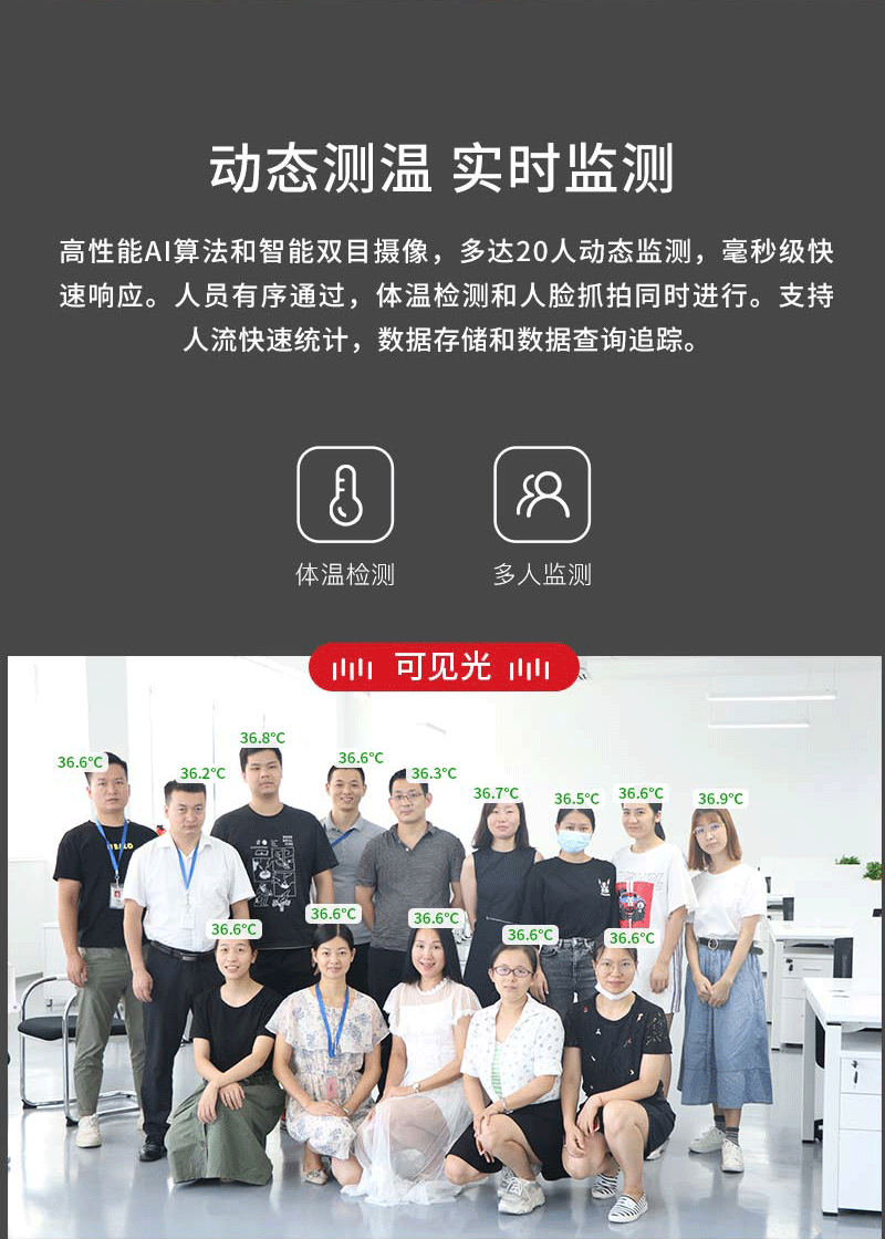 ·被測人員要求:戶外陽光照射后,或者劇烈運(yùn)動(dòng)后,需在室內(nèi)環(huán)境平靜適應(yīng)5分鐘后進(jìn)行測試;人員從戶外場景進(jìn)入室內(nèi),建議經(jīng)過回廊緩沖至少10秒鐘后,再步入檢測位置,如果室內(nèi)外溫差較大時(shí),建議在室內(nèi)停留2~3min再行檢測;確保待測人員整個(gè)面部處于設(shè)備攝像視野內(nèi),同時(shí)面部及額頭不能被遮擋(帽子、圍巾、墨鏡、面具、退燒貼等可能遮擋面部的物件,建議先提前摘下,適應(yīng)0.5-1分鐘后再進(jìn)行測試。)