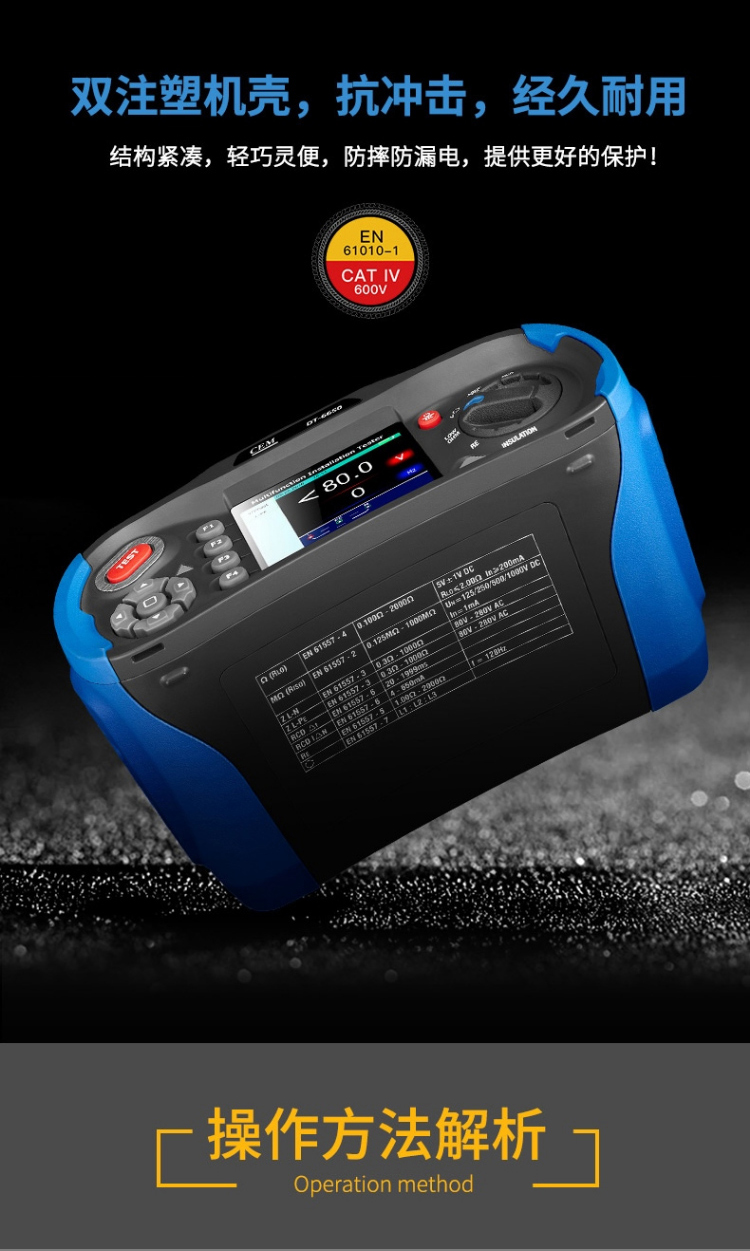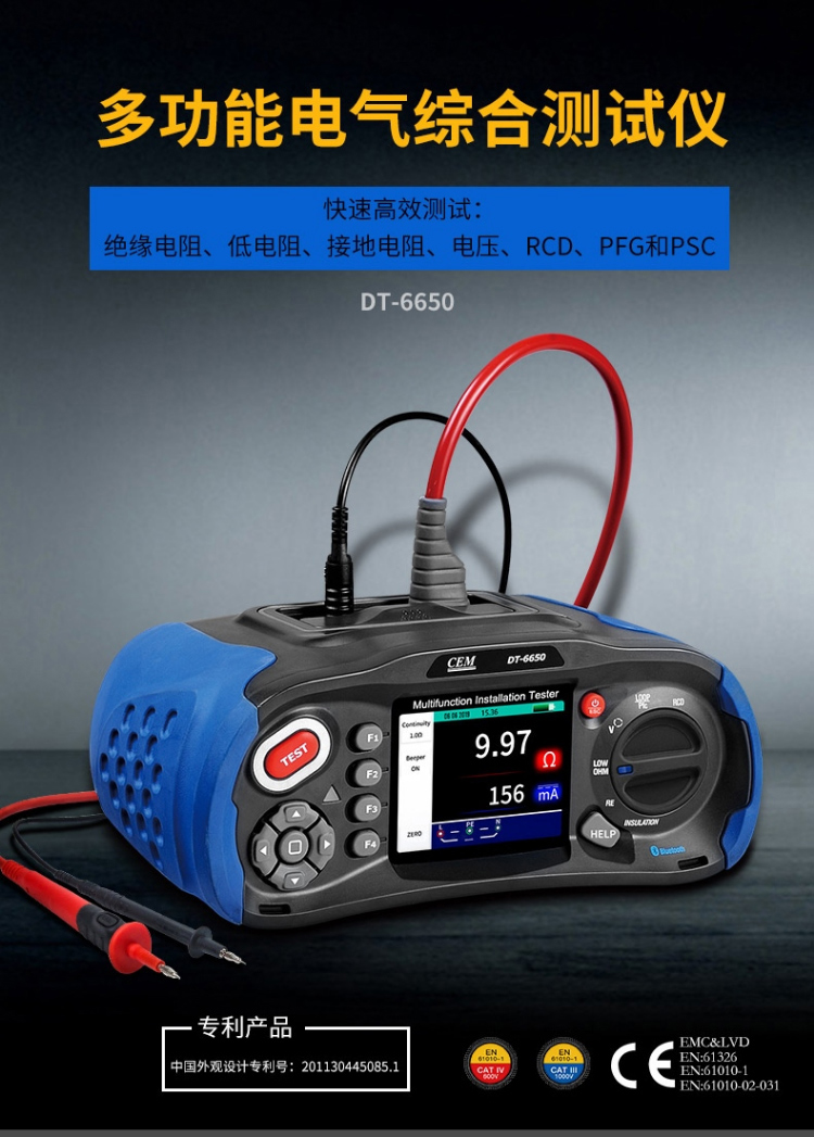 CEM DT-6650專業的多功能電氣綜合測試儀, 3.5"高清彩色TFT液晶顯示屏,雙注塑機殼,可測絕緣電阻、接地電阻、低電阻、回路電阻、電壓、RCD、PFG和PSC,并有配套軟件系統,同時具有快速取樣、雙顯示、清晰的按鍵和大屏等優點,方便用戶簡單清晰地操作,可以確保電氣裝置在家庭、商業、工業等領域應用的安全性,以及固定接線安裝的安全性和準確性,是電力電氣領域的專業電力檢驗工具。