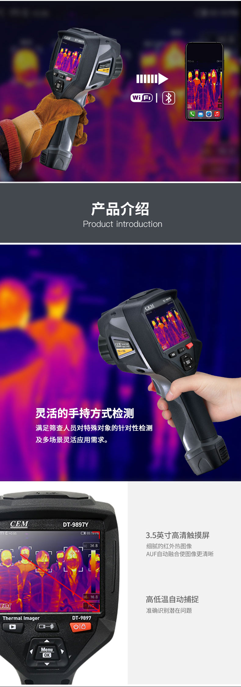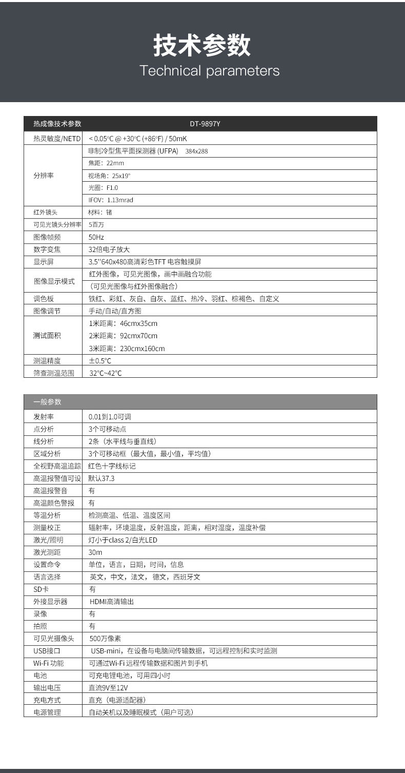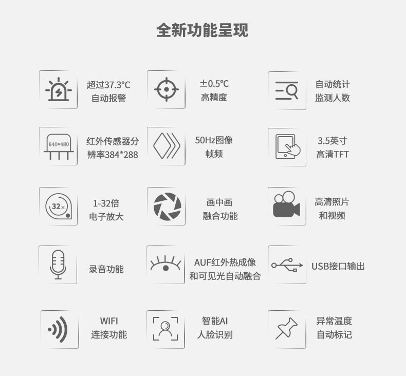 分辨率:384*288、圖像幀頻:50HZ、篩查測溫范圍:32-42℃、HDMI輸出大屏全屏顯示、AI人臉識別、自動統計監測人數、可同時完成多人測溫。
