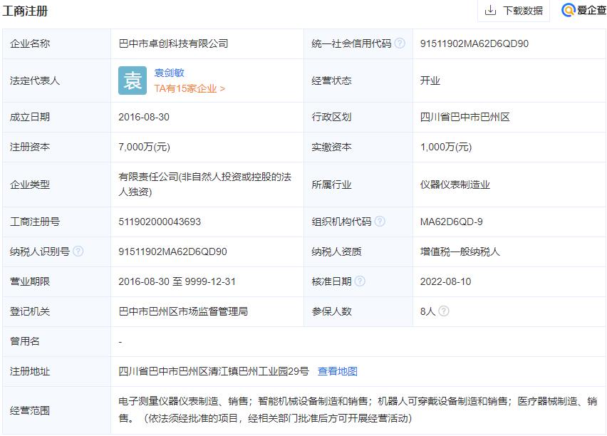 現巴中市卓創科技有限公司注冊資本:7,000萬(元) 經營范圍:電子測量儀器儀表制造、銷售;智能機械設備制造和銷售;機器人可穿戴設備制造和銷售;醫療器械制造、銷售。