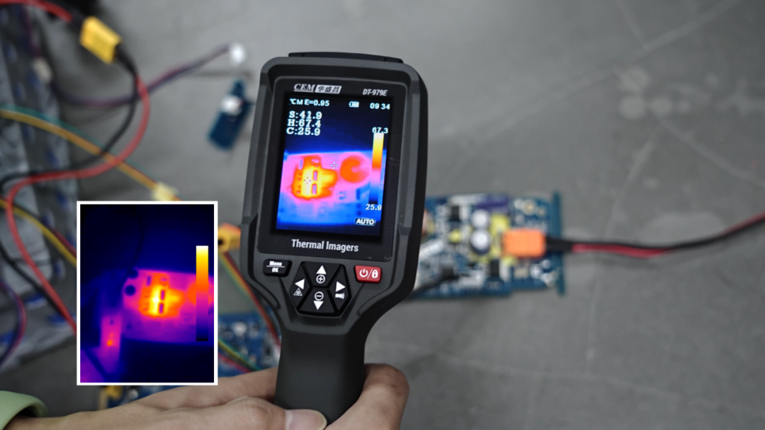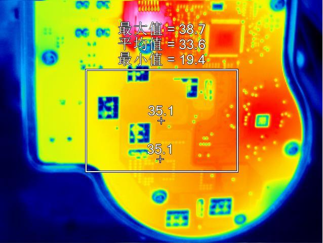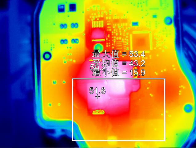 使用紅外熱像技術對PCB電路板進行發熱測試。下圖為PCB電路板的發熱情況測試,需要觀測PCB電路板表面的溫度分布情況,來確認是否處于工作溫度內。