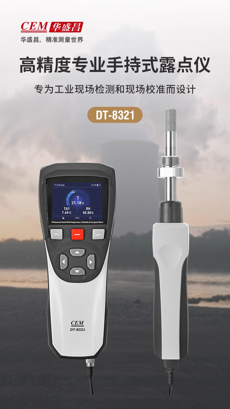 CEM DT-8321是CEM華盛昌新設計、研發和制造的一款高精度專業手持式露點儀,精度高范圍廣,能在較寬的測量范圍內準確測量露點溫度,探頭可直接插入加壓過程中,并快速響應測試過程環境條件,為工業露點測量應用提供準確快速的測量。產品廣泛應用于實驗室、電力電氣、SF6氣體測量、精密制造、化工制藥等領域的大溫度、大壓力范圍內的直接過程露點測量。