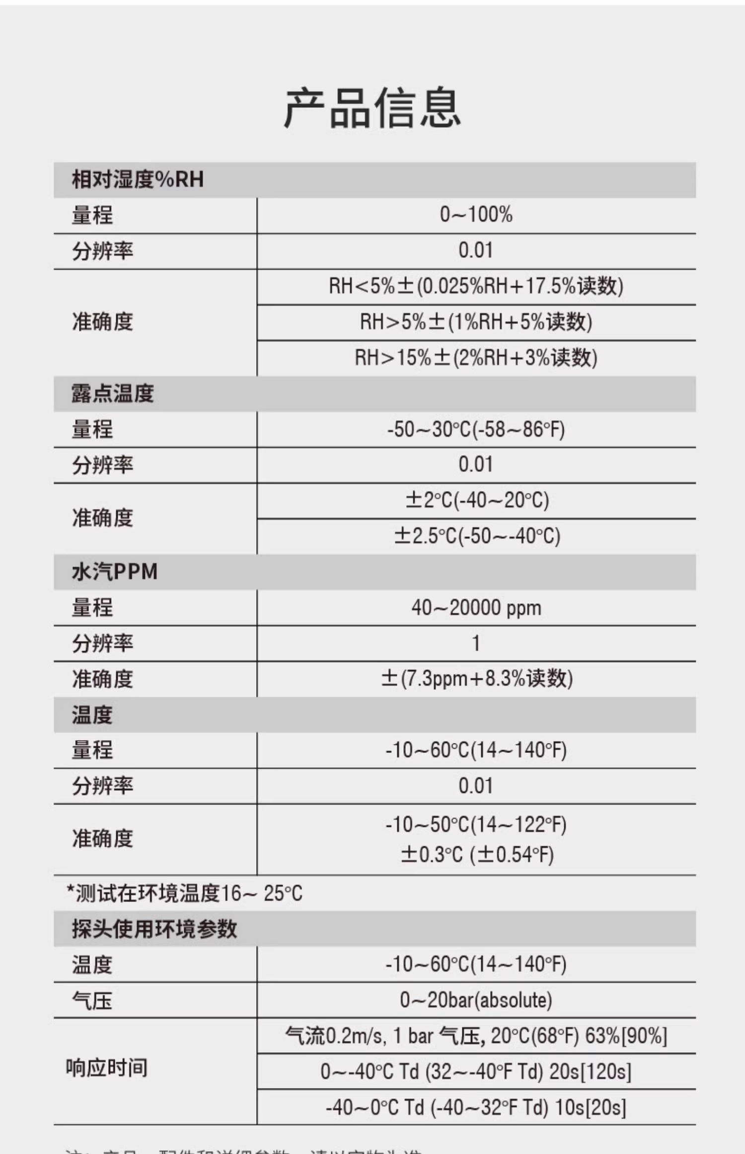高品質傳感器,測量更準確,適用于低露點測量。測量范圍達-50至+30°C,低濕度測量<5%RH。●傳感器可承受凝結,無需擔心結露影響測量精度。